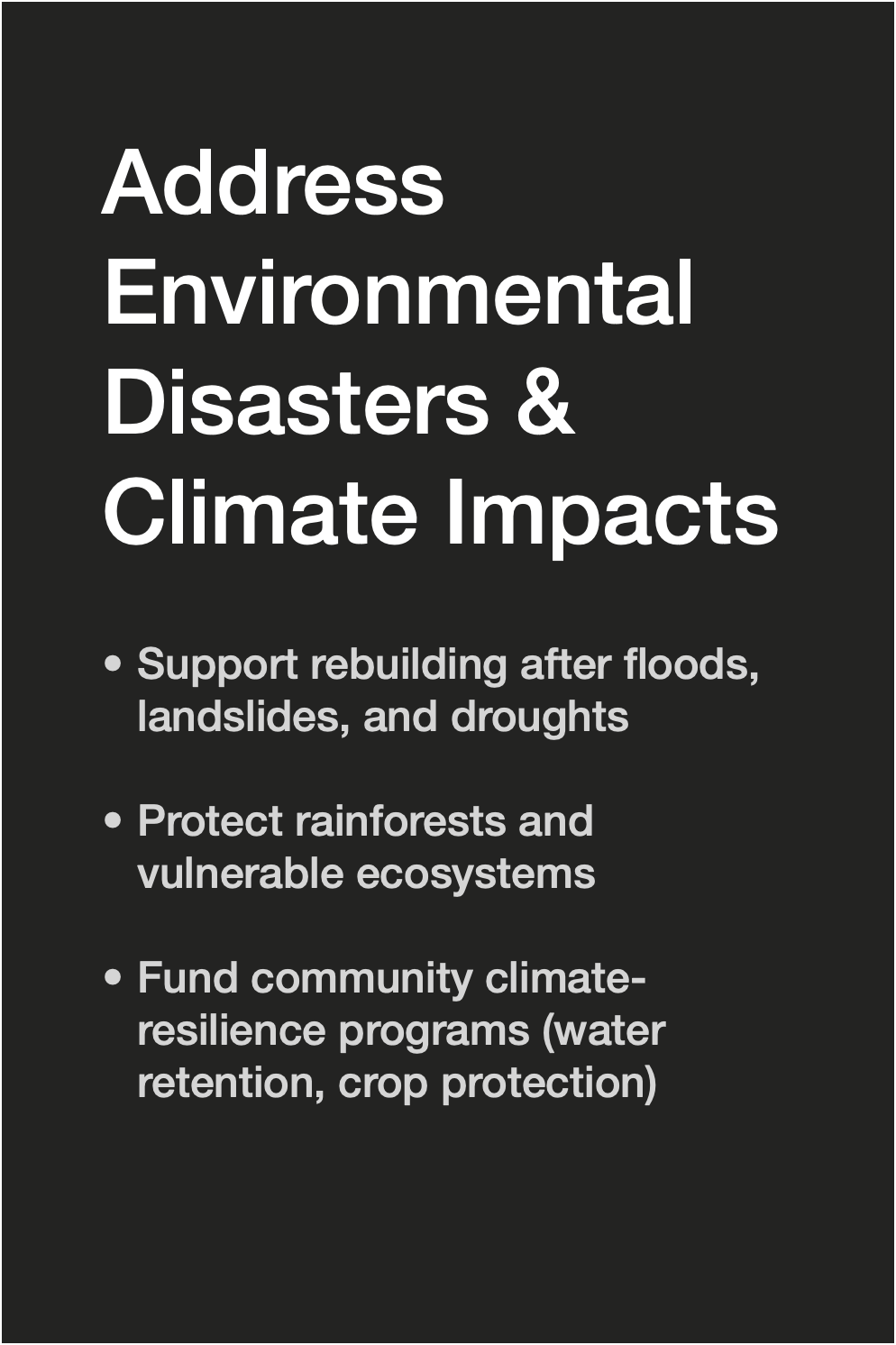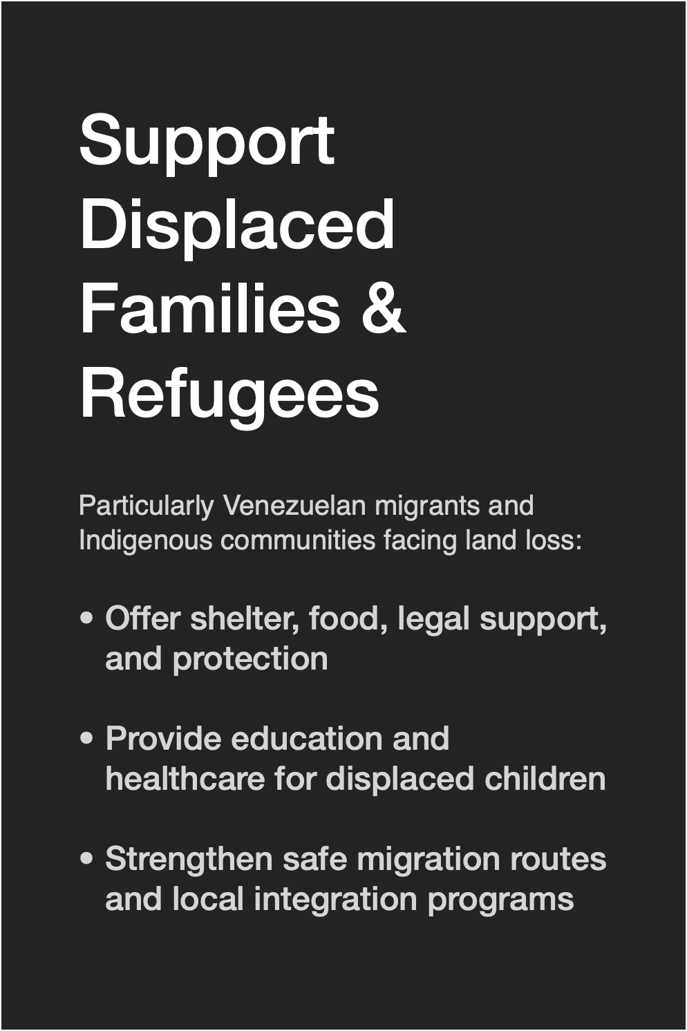 Our mission is to support and uplift vulnerable communities across South America by addressing poverty, food insecurity, environmental disasters, healthcare shortages, and the displacement of families.